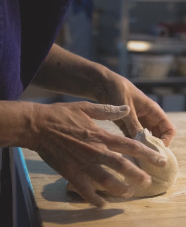 Le travail commence par le rafraîchi du levain. Une fois qu'il est “à point”, on l'incorpore à la pâte et on pétrit en douceur pour ne pas brutaliser le gluten fragile des blés anciens. Viennent ensuite les temps longs de la fermentation et les différentes manipulations. Autant d'étapes qui constituent un processus de production propre à chaque artisan.ne et durant lequel il est essentiel d'être à l'écoute de ce qui se passe dans la pâte.